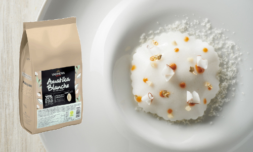 One of the options we have is the Amatika 35% Blanche, which is an almond-based couverture. That's using just cocoa butter and broken-down almond, which has been balanced out, giving a clean white flavour. For example, you can use this for a vegan afternoon tea. It won't be quite as clean as the Opalys 33%, but you’ll still get a good flavour. The thing to remember is, it's made with whole almonds, so it's going to have a fresh, fatty almond flavour, and obviously, it contains nuts. If we're talking free-from, you must bear that in mind for a nut allergy.