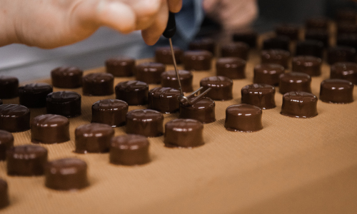 If you want to mix a chocolate directly with the caramel, you want to go with quite a deep, rich chocolate, something like Nyangbo 68%, a single-origin chocolate from Ghana. Or if you’re bringing in acidity, a classic combination which I learned way back in the day from Paul A. Young was a mixture of Manjari 64% with salted caramel, which balances out the sweetness with red fruit acidity. That acid mixed with salt, sweetness from the sugar and fat from the butter. It’s a winner for all around!